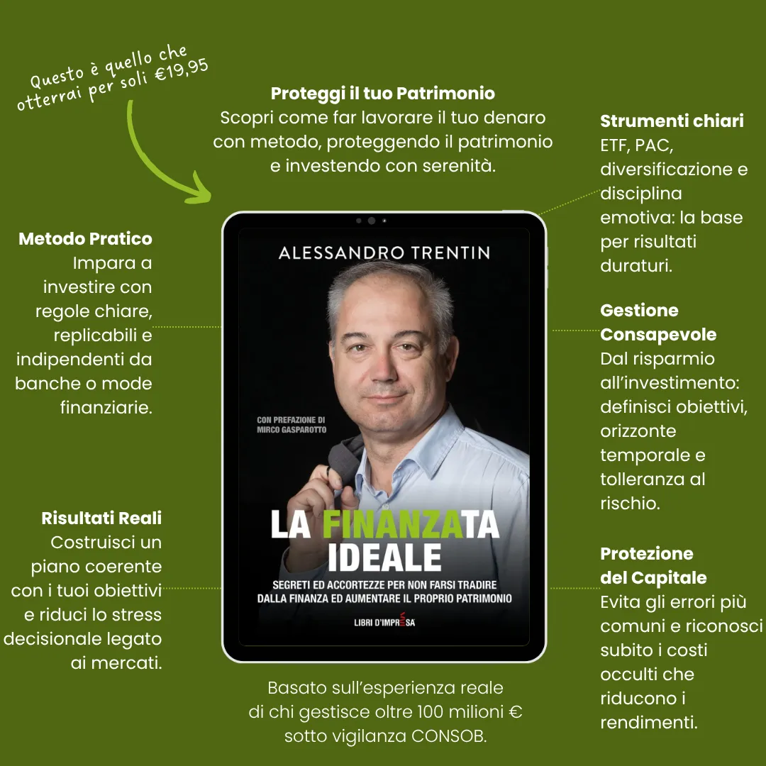 La Finanzata Ideale nasce da questa esperienza concreta: non è teoria, ma il condensato di un metodo che Alessandro Trentin applica ogni giorno per proteggere e far crescere i patrimoni reali di famiglie e imprenditori italiani.